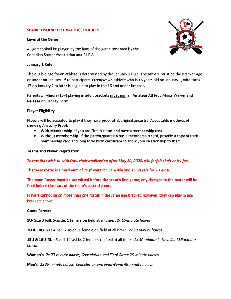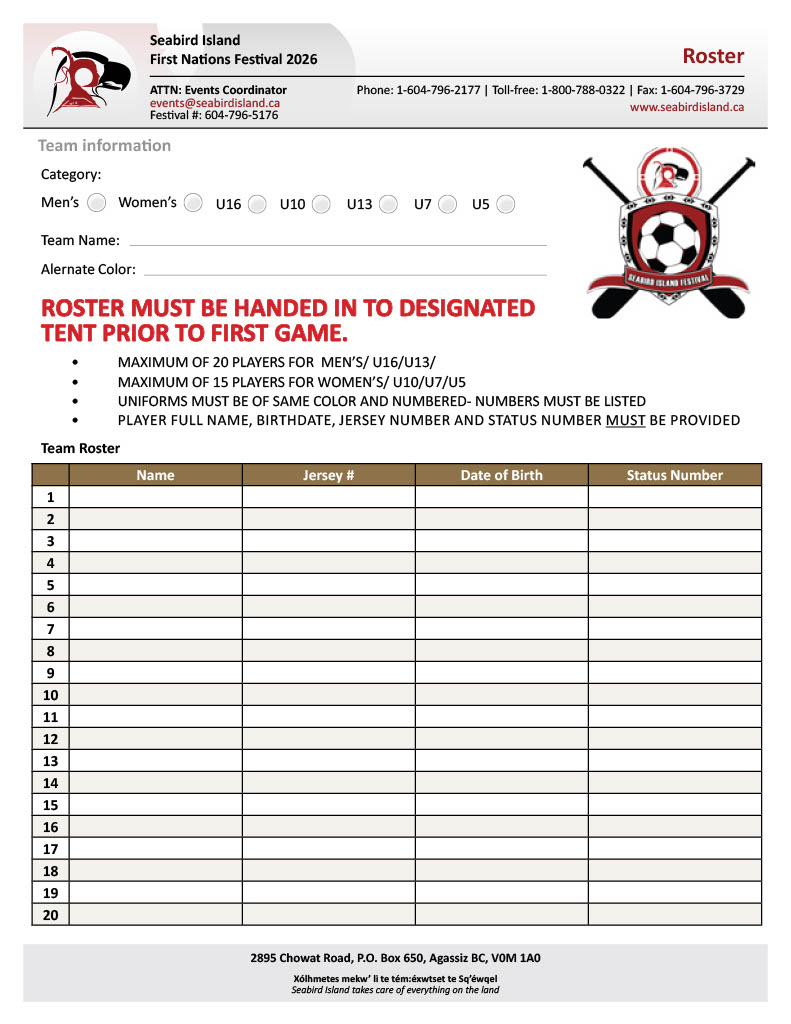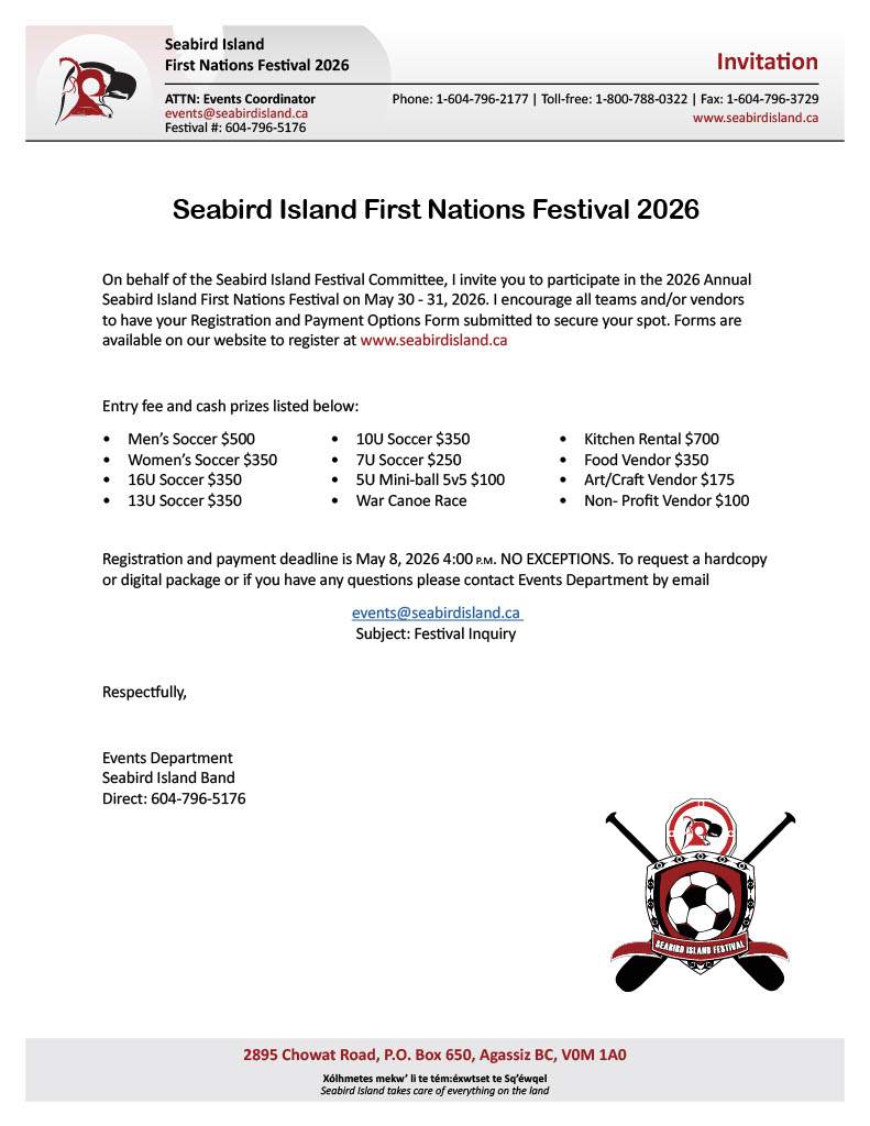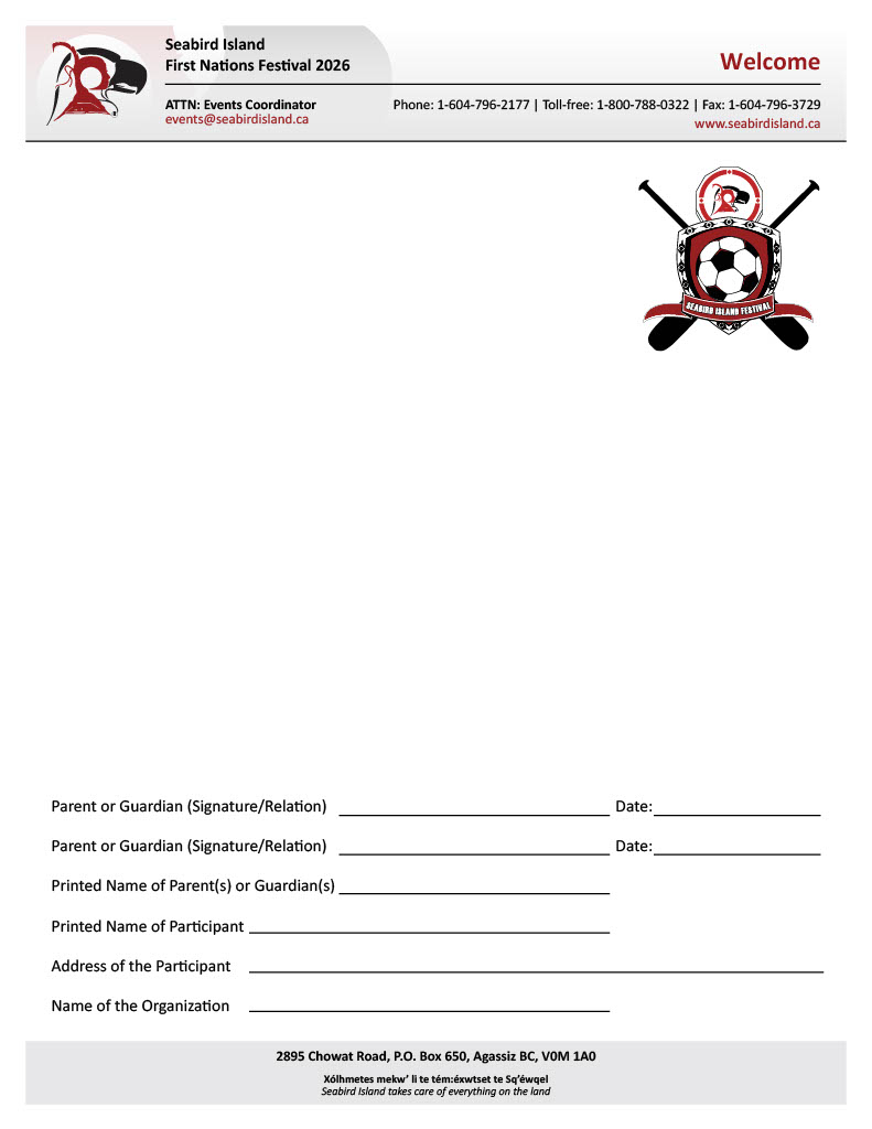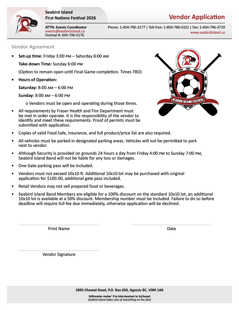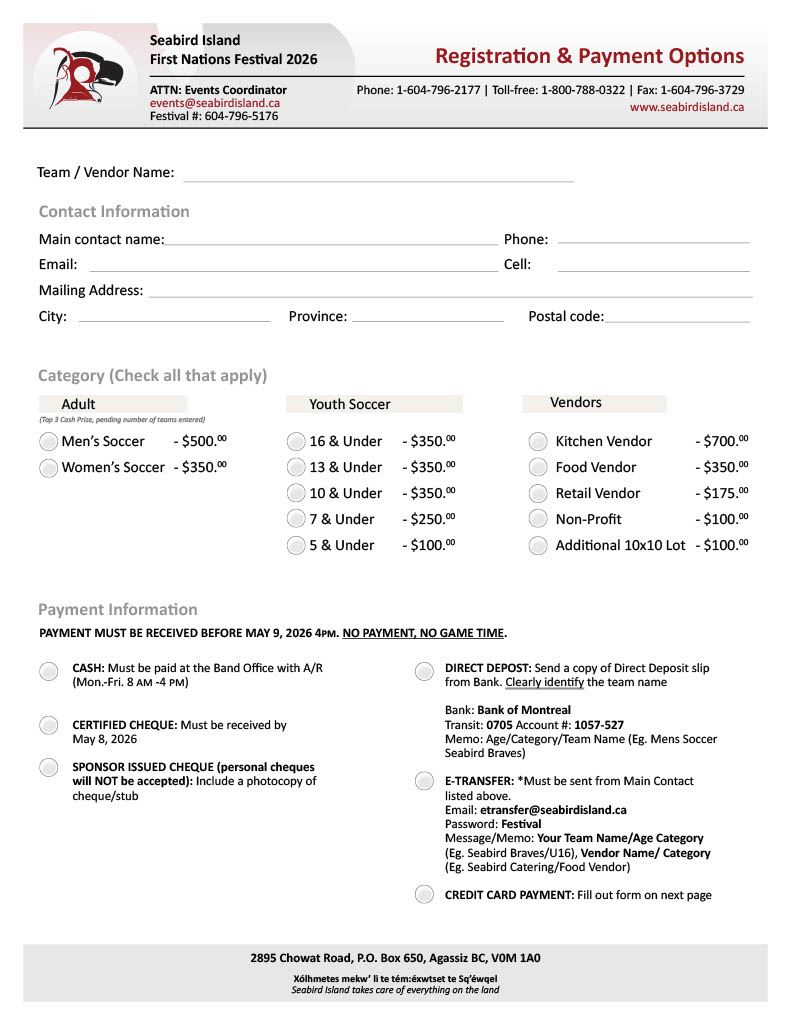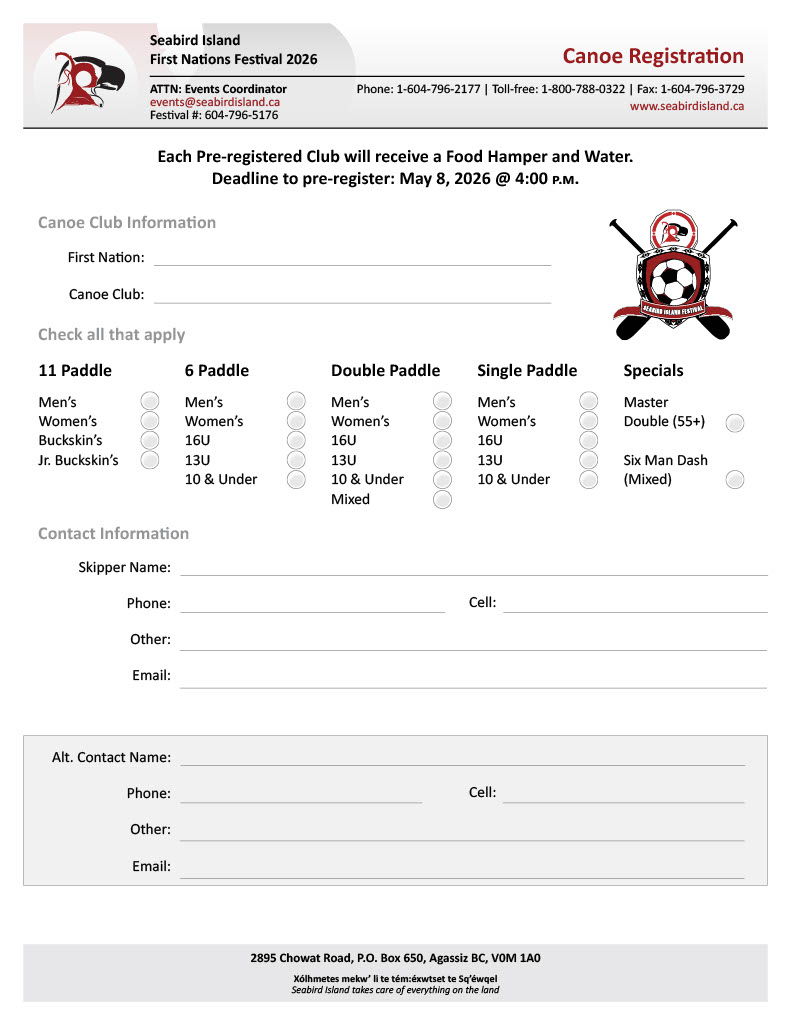 Quick Links FESTIVAL MAP 2026 Seabird Island Registration Forms Registration and payment deadline is May 8, 2026, by 4:00 pm. To request a hard copy or digital package, or if you have any questions, please contact our team by email: events@seabirdisland.ca General Inquiries2895 Chowat RoadAgassiz, BC, CanadaV0M 1A0Ph: 1-604-796-5176E: events@seabirdisland.ca Festival Invitation Canoe Registration Registration & Payment Vendor Application Tournament Rules Soccer Registration Welcome Banner 2025 SPONSORS